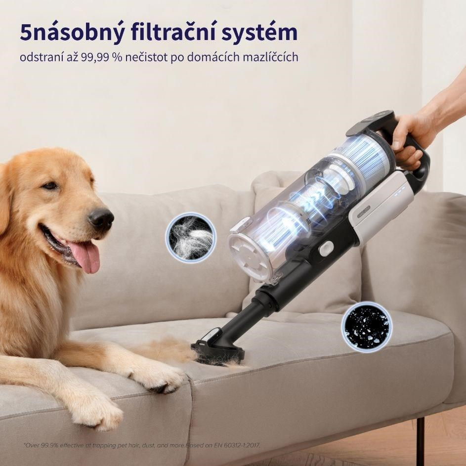 Tyčový vysavač Levoit je navržený, aby maximálně usnadnil úklid vašeho domova, ať už ho sdílíte se čtyřnohým, nebo dvounohým miláčkem. Vysavač je vybaven rotačním kartáčem s kombinací gumových a textilních lamel, který byl navržen tak, aby na něm nedocházelo ke hromadění namotaných vlasů nebo chlupů. Zároveň je ale kartáč efektivní a zachytává maximální množství nečistot. Vysavač pracuje s 22,2V vyjímatelným akumulátorem s kapacitou 2200 mAh a indikací nabití. Motor je s výkonem 180 W nezvykle tichý, při běžném provozu vydává 74 dB, v Turbo režimu pak 81 dB. Vysavač s plně nabitou baterií dokáže pracovat až 50 minut, což umožní úklid celého obydlí na jedno nabití. Úklid s LVAC 200 je radost díky jeho velmi nízké hmotnosti 1,45 kg. Díky tomu je snadné s vysavačem odstranit i pavučiny ze stropu, prach ze žaluzií nebo nečistoty pod nábytkem. V balení naleznete dlouhou a krátkou násadu, rotační kartáč, 2v1 kartáč na čalounění nebo zvířecí srst a 2v1 štěrbinový nástavec s kartáčem. Tím máte perfektní sadu nástrojů pro kompletní úklid. Levoit LVAC si hravě poradí se všemi povrchy, ať už jsou to koberce, tvrdé podlahy nebo čalounění. Kartáčový nástavec je navíc vybavený LED světlem, takže umožní práci v tmavých zákoutích, a navíc osvětluje přítomné nečistoty. Vysavač v sobě skrývá 5násobný filtrační systém, který odstraňuje částice od velikosti 0,3 mikrometrů. Nečistoty se shromažďují v 0,75L nádobě s mechanizmem pro snadné a hygienické vyprazdňování. Filtry i kartáč jsou jednoduše vyjímatelné a omyvatelné.