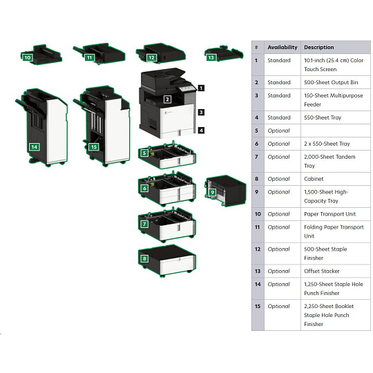 .Part Number 20L8300 Print Technology Color Laser Function Color Copying Color Faxing Color Printing Color Scanning Trusted Platform Module (TPM) The Trusted Platform Module (TPM) is not available in some countries. Workgroup Size Large Workgroup Touch Screen Display Yes Display Lexmark e-Task 10-inch (25 cm) class color touch screen Print Speed (Letter, Black) Up to 55 ppm4 Print Speed (Letter, Color) Up to 55 ppm4 Print Speed (Letter, Black) Duplex Up to 55 spm4 Print Speed (Letter, Color) Duplex Up to 55 spm4 Time to First Page (Black) As fast as 7.1 seconds Time to First Page (Color) As fast as 8.2 seconds Duplex (2-sided) Printing Integrated Duplex Print Resolution, Black 1200 x 1200 dpi 4800 Color Quality Print Resolution, Color 1200 x 1200 dpi 4800 Color Quality Copy Speed (Letter, Black) Up to 55 cpm4 Copy Speed (Letter, Color) Up to 55 cpm4 Copy Speed (Letter, Black) Duplex Up to 55 spm4 Copy Speed (Letter, Color) Duplex Up to 55 spm4 Time to First Copy (Black) As fast as 8.5 seconds Time to First Copy (Color) As fast as 9.5 seconds Reduce / Enlarge Range 25 - 400 % A4/Ltr Simplex Scan Speed (Black) Up to 120/120 sides per minute A4/Ltr Simplex Scan Speed (Color) Up to 120/120 sides per minute A4/Ltr Duplex Scan Speed (Black) Up to 240/240 sides per minute A4/Ltr Duplex Scan Speed (Color) Up to 240/240 sides per minute Scan Area, Maximum 11.69 x 17.0 inches ADF Scan DADF (single pass Duplex) Scanner Type Flatbed scanner with automatic document feeder Scan Resolution, Enhanced 600 x 600 dpi Scan Resolution, Optical 300 x 300 dpi Optical Scanning Resolution 300 X 300 dpi Scan File Formats (Send as) JPEG, JPG PDF Secure PDF TIFF Archival PDF (A-1a, A-1b) Searchable PDF TXT RTF DOCX Scan Destinations e-mail FTP USB Flash drive USB or Network connected computer Processor Speed Quad Core, 1.2 GHz Memory, Standard 4 GB Memory, Maximum 4 GB Hard Disk Intelligent Storage Drive included; Magnetic Hard Disk available Apple Operating Systems Supported Support is provided through AirPrint and AirScan only Citrix MetaFrame Microsoft Windows Server 2012 R2 Datacenter Edition running Citrix XenApp 7.5, 6, 7, 8, 9, 11, 12, 13, 14, 15, 16 Microsoft Windows Server 2012 Datacenter Edition running Citrix XenApp 7.5, 6, 7, 8, 9, 11, 12, 13, 14, 15, 16 Microsoft Windows Server 2012 Foundation running Citrix XenApp 6.0, 6.5 Microsoft Windows Server 2012 Essentials running Citrix XenApp 6.0, 6.5 Microsoft Windows Server 2012 Standard running Citrix XenApp 6.0, 6.5 Linux Operating Systems Supported Ubuntu 20.04 Debian 10 SUSE Linux Enterprise Server 12 SP5 OpenSUSE 15.2 Debian 11 Ubuntu 22.04 Fedora 36 Fedora 37 SUSE Linux Enterprise Server 15 SP4 OpenSUSE 15.4 Red Hat Linux 8.7 Red Hat Linux 9.1 Microsoft Windows Operating Systems Supported Windows Vista Windows Vista x64 Windows Server 2008 Windows Server 2008 x64 Windows Server 2008 running Terminal Services Windows Server 2008 x64 running Terminal Services Windows 7 Windows 7 x64 Windows Server 2008 R2 Windows Server 2008 R2 running Terminal Services Windows 8 Windows 8 x64 Windows Server 2012 Windows 8.1 Windows Server 2012 R2 Windows 10 Windows Server 2016 Windows Server 2019 Windows Server 2022 Windows 11 Novell Operating Systems Supported Novell NetWare 6.5 Open Enterprise Server Novell Open Enterprise Server 2 (SP3) on SuSE Linux Enterprise Server 10 SP4 (x86 and x64) 3 Novell Open Enterprise Server 11 (SP3) on SuSE Linux Enterprise Server 11 SP4 (x86 and x64) Novell Open Enterprise Server 11 (SP3) on SuSE Linux Enterprise Server 12 SP1 (x86 and x64) Novell Open Enterprise Server 15 (SP1) on SuSE Linux Enterprise Server 11 SP4 (x86 and x64) Other Operating Systems Supported Virtually any platform supporting TCP/IP Included Paper Handling 550-Sheet Tray 150-Sheet Multipurpose Feeder 500-Sheet Output Bin Optional Paper Handling 550-Sheet Tray Offset Stacker 500-Sheet Staple Offset Finisher 2 x 550-Sheet Tray 2000-Sheet Tandem Tray Cabinet 1,500-Sheet High-Capacity Tray Paper Transport Unit Folding Paper Transport Unit 1,250-Sheet Staple Hole Punch Finisher 2,250-Sheet Booklet Staple Hole Punch Finisher Paper Input Capacity, Standard Up to 700 pages 20 lb or 75 gsm bond Paper Input Capacity, Maximum Up to 4750 pages 20 lb or 75 gsm bond Paper Output Capacity, Standard Up to 500 pages 20 lb or 75 gsm bond Paper Output Capacity, Maximum Up to 2650 pages 20 lb or 75 gsm bond Paper Weight Range Supported - Standard Tray (lb.) 16 - 80 lb. Paper Weight Range Supported - Multipurpose Feeder (lb.) 16 - 80 lb. A3 / 11 x 17 Yes ADF 300-Sheet Automatic Document Feeder ADF Paper Input Capacity Up to 300 pages 20 lb or 75 gsm bond ADF Paper Output Capacity Up to 300 pages 20 lb or 75 gsm bond Finishing Option Yes Finishing Functions Offset stacking Stapling Hole punching Number of Paper Inputs, Standard 2 Number of Paper Inputs, Maximum 6 Media Types Supported Card Stock Envelopes Glossy Paper Labels Plain Paper Vinyl Labels Refer to the Paper & Specialty Media Guide Media Sizes Supported 10 Envelope 7 3/4 Envelope 9 Envelope A3 A4 A5 B5 Envelope C4 Envelope C5 Envelope DL Envelope Hagaki Card Executive Folio JIS-B4 JIS-B5 Ledger Legal Letter Statement Oficio A6 SRA3 Standard Ports USB 2.0 Specification Hi-Speed Certified (Type B) Gigabit Ethernet (10/100/1000) Front USB 2.0 Specification Hi-Speed Certified port (Type A) 802.11a/b/g/n/ac + Apple iBeacon Optional Local Ports Internal RS-232C serial Internal 1284-B Bidirectional Parallel Optional Network Ports MarkNet N8230 Fiber Ethernet Print Server Direct USB Yes Ethernet Network Yes Wireless Yes Wireless Network WPA2™ - Personal WPA™ and WPA2™ - Personal 802.1x Authentication: MD5, MSCHAPv2, LEAP, PEAP, TLS, TTLS Network Protocol Support TCP UDP IPSEC w/ IPv4 IPSEC w/ IPv6 ICMP IGMP IPv4 IPv6 Network Printing Methods Direct IP (Port 9100) Enhanced IP (Port 9400) FTP IPP 1.0, 1.1, 2.0 (Internet Printing Protocol) Microsoft Web Services WSD Pull Printing Thin Print LPR Network Management Protocols WINS AP