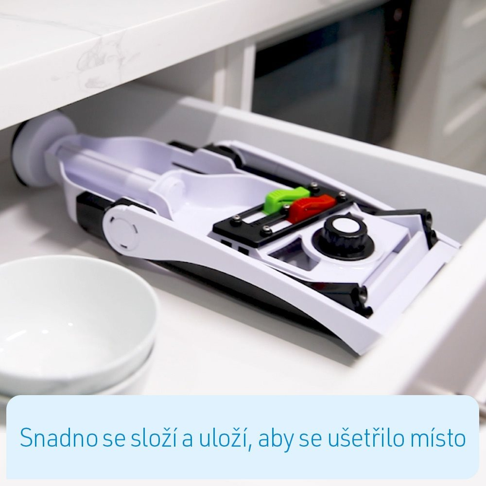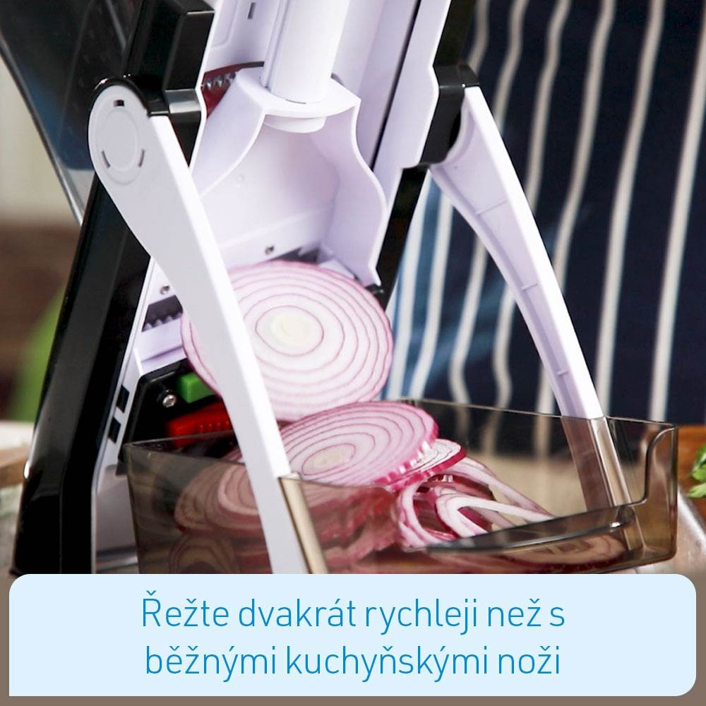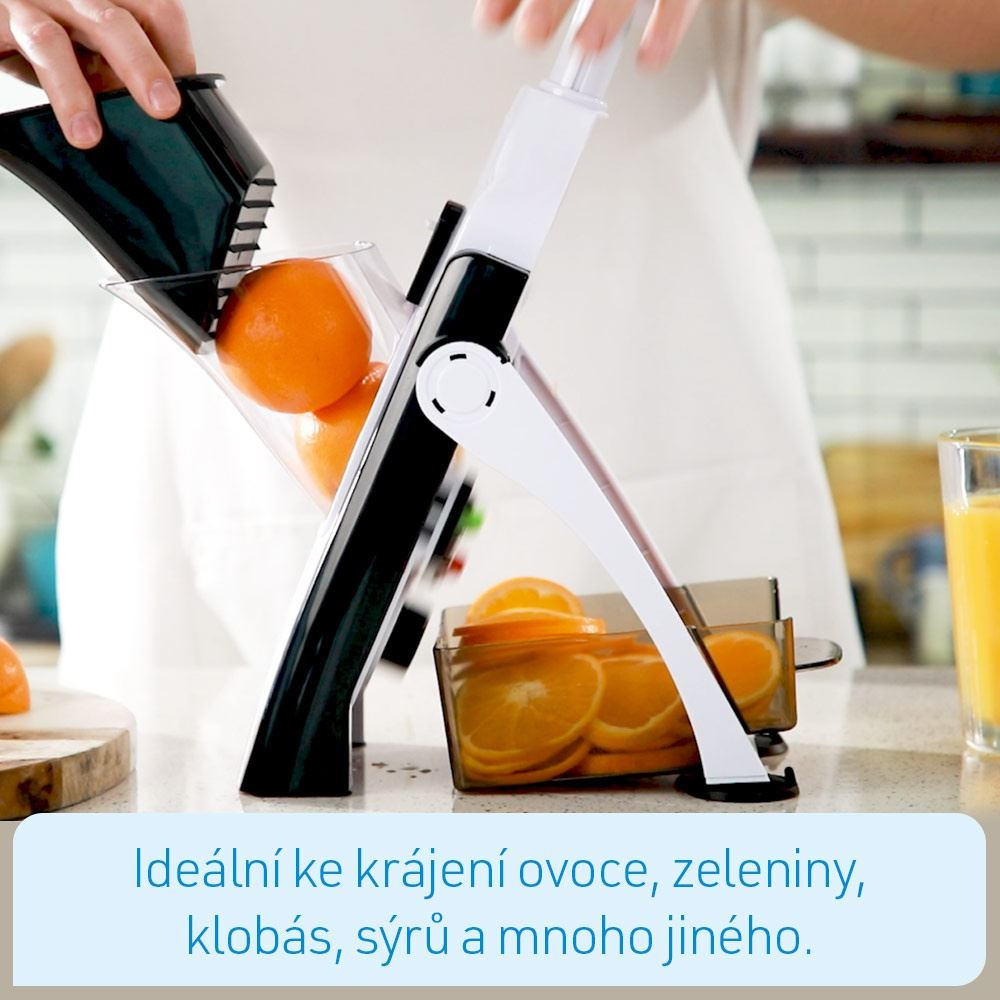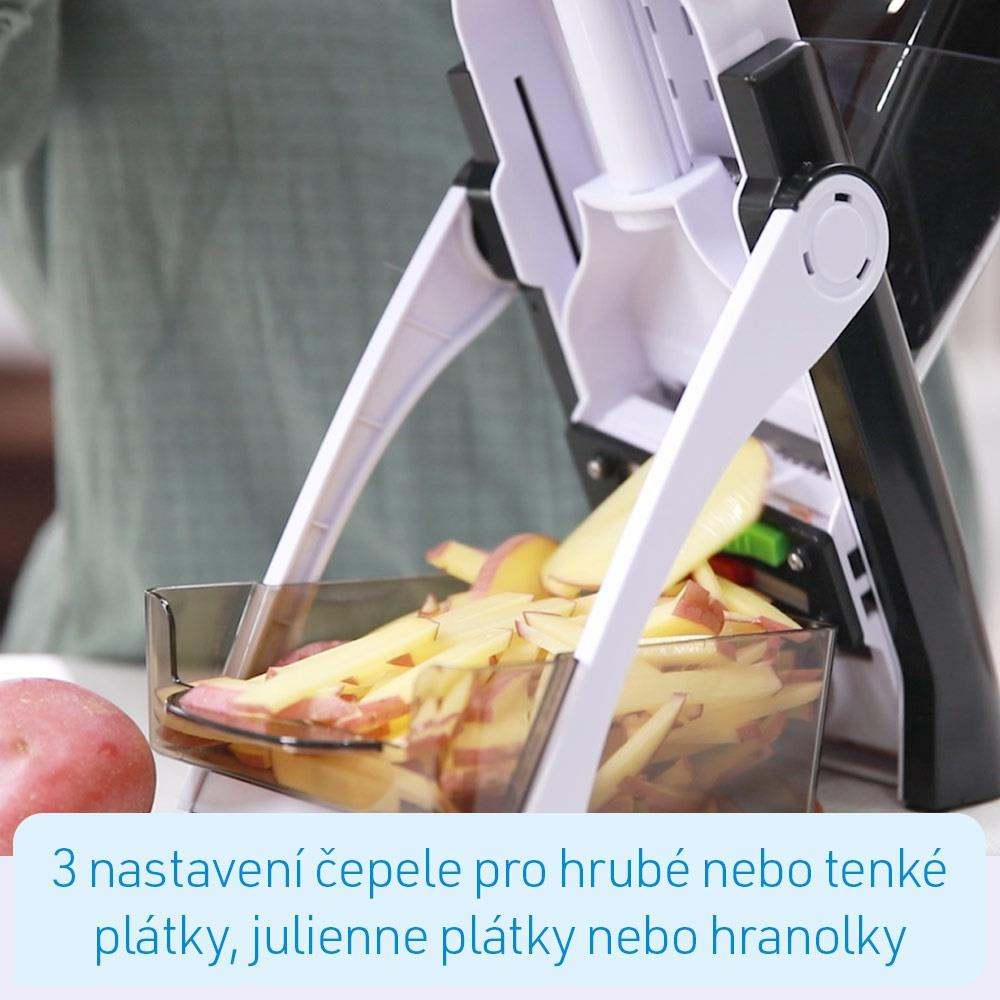 - 3 nastavení čepele pro hrubé nebo tenké plátky, julienne plátky nebo hranolky