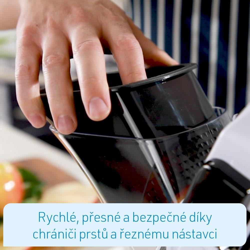 - Rychlé, přesné a bezpečné díky chrániči prstů a řeznému nástavci
