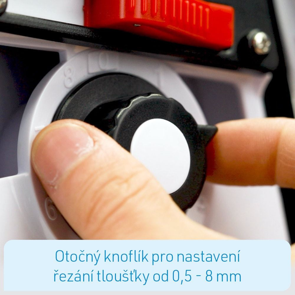 - Otočný knoflík pro řezání pro nastavení tloušťky od 0,5 - 8 mm
