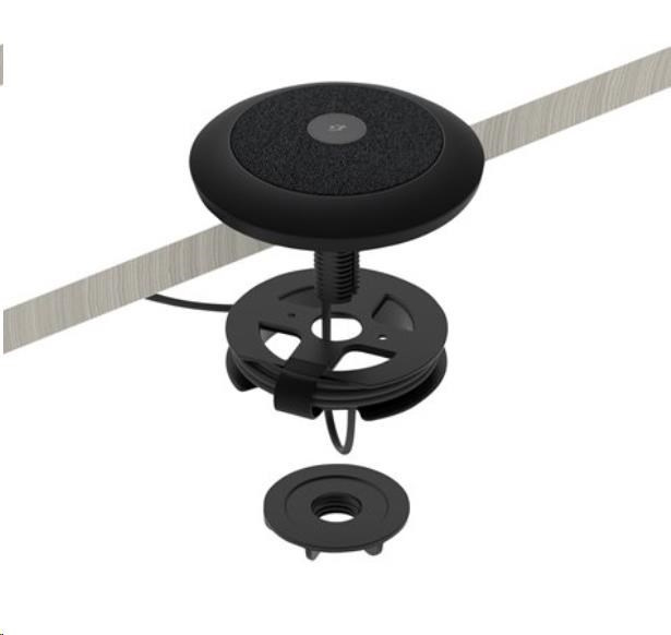Naviňte přebývající kabeláž na kabelovou cívku, čímž dosáhnete úhledného vzhledu konferenčního stolu nejen při pohledu seshora, ale i zespoda. Připevněte kabelovou cívku přímo k držáku stolních mikrofonů nebo k jinému povrchu pomocí přiloženého upevňovacího materiálu.