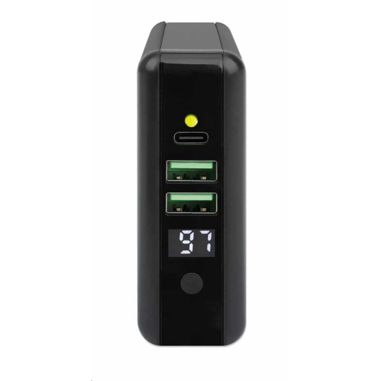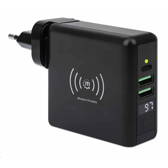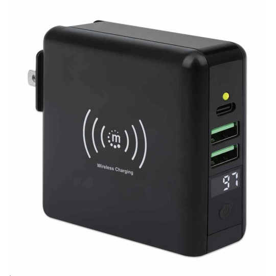 The Manhattan 4-in-1 Travel Wall Charger and Powerbank 8,000 mAh provides you with incredibly useful functions on one device. Use it as a USB wall charger to charge smartphones, tablets, eReaders, headphones and more from two USB-A and one USB-C port with per-port power up to 5 V / 2.4 A. You can also skip the wires altogether and charge compatible mobile devices on the 5 W wireless charging pad. For even more convenience, this all-rounder lets you charge on the go without plugging into a socket since it's also an 8,000 mAh powerbank. Its convenient digital number display lets you check the remaining battery at any time. Recharge the powerbank directly via AC on a power outlet or through its USB-C port. Finally, if you're an international traveler, you'll love its foldable US and swappable UK and EU plugs that let you charge devices in the many regions that offer these outlet types.