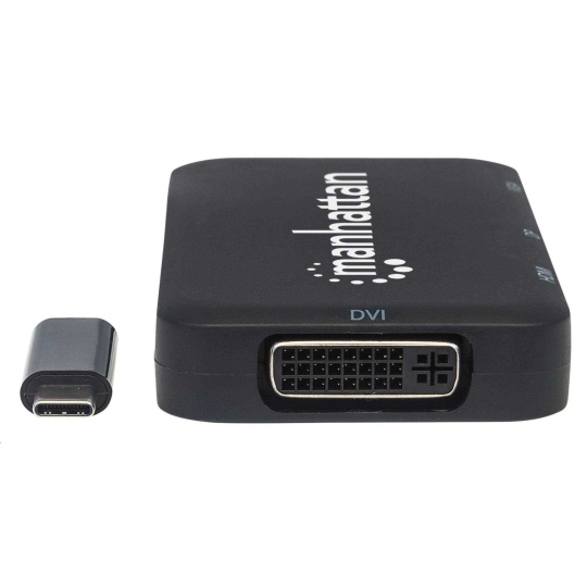 The Manhattan USB-C 4-in-1 Audio/Video Converter establishes a fast, simple and convenient link between newer USB Type-C equipped media sources (computers, tablets, Smartphones, etc.) and existing HDMI, DisplayPort, VGA or DVI displays (monitors, projectors, etc.). The Manhattan USB-C 4-in-1 Audio/Video Converter is easy and quick to install — no complicated configuration or setup required. Its all-in-one design achieves a compact, integrated solution that eliminates unnecessary cables, tangles and clutter to keep installations and workspaces neat and orderly. Extend the service life of your equipment, and fully realize the investment and value of your HDMI, DP, VGA or DVI displays, projectors and peripherals with a Manhattan USB-C 4-in-1 Audio/Video Converter.