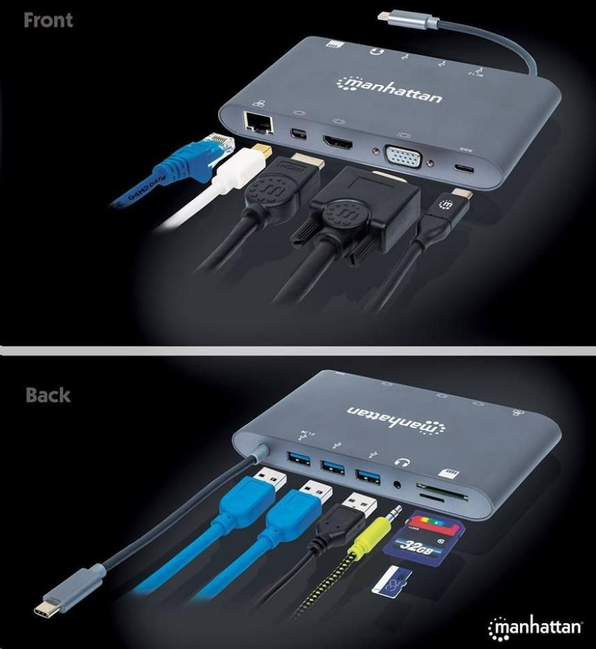 The Manhattan SuperSpeed USB-C to 7-in-1 Docking Station establishes a fast, simple and convenient link between newer USB Type-C-equipped media sources (computers, tablets, Smartphones, etc.) and an existing HDMI/Mini DP/VGA display (monitors, projectors, etc.), in either mirror- or extended-display mode. Create a mini-workstation by adding any USB 3.0 (and earlier) peripheral, such as a mouse, keyboard, hub, external memory device and more, with the integrated USB-A ports, Gigabit network connection, 3.5 mm Stereo and SD and Micro SD card slot, all while charging your device through the USB-C port.