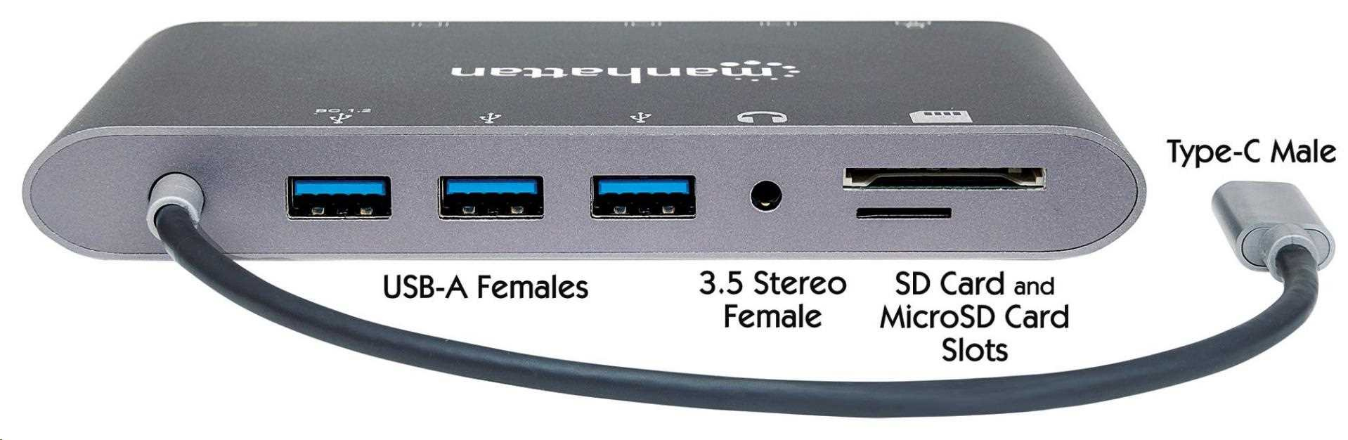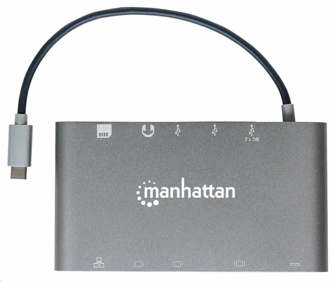 MANHATTAN Dokovací stanice USB-C 7v1, 1xHDMI, 1xVGA, 1xUSB-C,3xUSB, 1xRJ45, 1x3.5mm, šedá