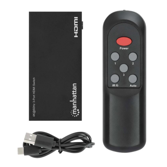Manhattan 3portový HDMI přepínač umožňuje spolehlivé a pohodlné přepínání mezi třemi různými HDMI zdroji a jedním displejem. Podporuje rozlišení až Ultra-HD 4K při 60 Hz a nabízí automatické přepínání na právě aktivní zařízení, stejně jako manuální volbu pomocí IR dálkového ovladače nebo tlačítka. Díky šířce pásma až 18 Gb/s, chroma subsamplingu 4:4:4 a podpoře HDR, Dolby Vision a Dolby Atmos poskytuje živé barvy a ostrý kontrast bez degradace obrazu. Kompatibilní je napříč různými zařízeními – herní konzole, streamovací boxy, notebooky nebo Blu-ray přehrávače.