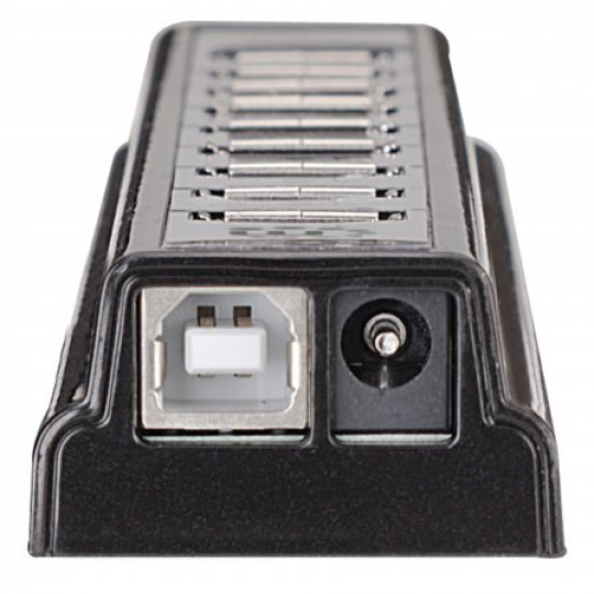 The Manhattan Hi-Speed USB Desktop Hub easily expands USB access for desktop and notebook computers to connect more peripherals and mobile devices. With 10 extra high-speed, backward-compatible ports, the Manhattan Hi-Speed USB Desktop Hub can manage almost any digital enthusiast’s growing collection of USB-enabled devices. It´s ideal for recharging MP3 players, cellphones, digital cameras and other mobile accessories and connecting keyboards, mice, Web cameras, flash drives, card readers and more. The compact and durable plastic case features the power and hub-to-PC ports on the side panel to help better organize connections and minimize cable clutter. Plug and Play with hot-swap capabilities, Windows7/8 and Mac compatibility, and data transfer speeds up to 480 Mbps help the Manhattan Hi-Speed USB Desktop Hub consolidate numerous, less-capable hubs into a single USB solution.