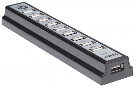 The Manhattan Hi-Speed USB Desktop Hub easily expands USB access for desktop and notebook computers to connect more peripherals and mobile devices. With 10 extra high-speed, backward-compatible ports, the Manhattan Hi-Speed USB Desktop Hub can manage almost any digital enthusiast’s growing collection of USB-enabled devices. It´s ideal for recharging MP3 players, cellphones, digital cameras and other mobile accessories and connecting keyboards, mice, Web cameras, flash drives, card readers and more. The compact and durable plastic case features the power and hub-to-PC ports on the side panel to help better organize connections and minimize cable clutter. Plug and Play with hot-swap capabilities, Windows7/8 and Mac compatibility, and data transfer speeds up to 480 Mbps help the Manhattan Hi-Speed USB Desktop Hub consolidate numerous, less-capable hubs into a single USB solution.