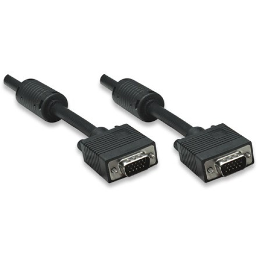 Manhattan SVGA Cables easily connect a monitor with a desktop or notebook computer. Ideal for use with video splitters, KVM switches and any HD15-equipped display, computer or device, Manhattan SVGA Cables are engineered and constructed of quality materials to deliver dependable transmissions in video applications. Full foil and braided shielding with ferrite cores help minimize EMI interference and mini-coax (RGB) with paired video wire construction combine to provide maximum conductivity and clear, crisp images with reduced distortion over extended distances.