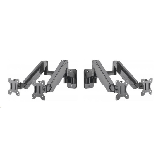 This Manhattan Universal Gas Spring Dual Monitor Wall Mount offers two jointed gas-spring arms that securely hold two 17" to 32" TV or monitors. This mount's gas springs promote easy movement of the monitors or TVs to a more comfortable viewing angle with the lightest touch. Designed to give back much needed desktop real estate and maximize productivity, the Manhattan Universal Gas Spring Dual Monitor Wall Mount provides more flexibility, reach, and overall enjoyment of whatever task is at hand.