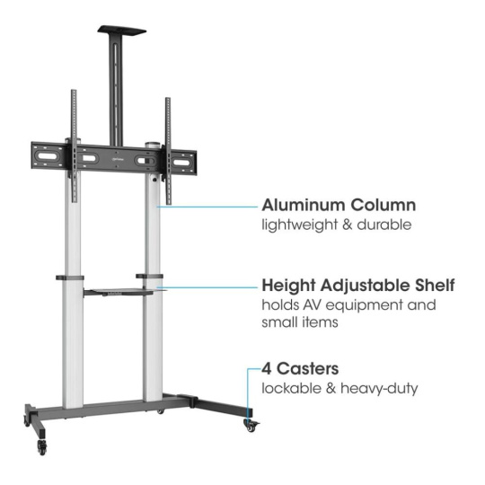Přineste si televizi k sobě. Když ji potřebujete umístit jinam, snadno ji tam přemístíte. Hliníkový multimediální televizní vozík Manhattan s nastavitelnou výškou umístí televizor na kolečka, takže jej můžete podle potřeby přenášet do různých prostor, vyhnout se nepříjemnému oslnění nebo překonat omezující uspořádání nábytku. Tento kvalitně zpracovaný pojízdný televizní stojan, který vyhovuje standardu VESA a je vyroben z kvalitních hliníkových materiálů, podporuje velké televizory s úhlopříčkou až 100“ a unese celkovou hmotnost až 80 kg (176 liber). Tento pojízdný televizní vozík má všechny výhody nadpodlažní instalace na stěnu - zvýšený výhled, profesionálnější vzhled, větší bezpečnost televizoru atd. - a navíc mobilní flexibilitu a nezávislost.