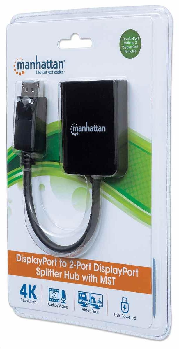 Ideal for trade shows, classrooms, video conferencing, presentations and retail applications, the Manhattan DisplayPort to Dual DisplayPort - MST Hub features a built-in booster for added signal strength. It’s a great choice for splitting and distributing a synchronous signal, in either mirrored or extended modes, to multiple 4K DP displays. MST mode creates a video wall from two displays giving the user a more immersive experience while gaming, in a conference setting or in a home office.