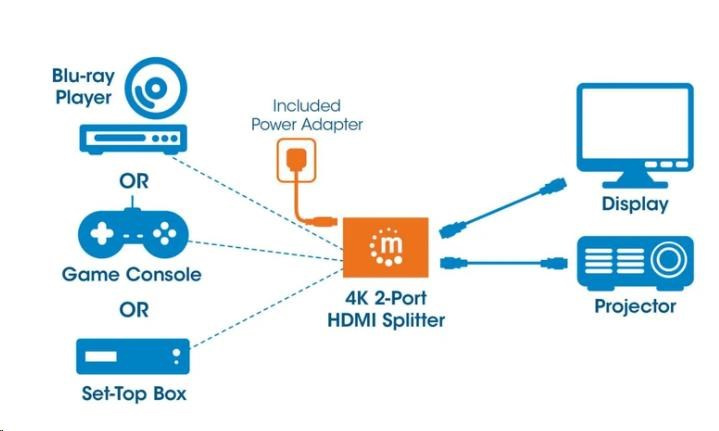 The Manhattan 4K 2-Port HDMI Splitter with built-in booster streams a 4K HDMI signal from a single UHD source to up to two UHD displays.