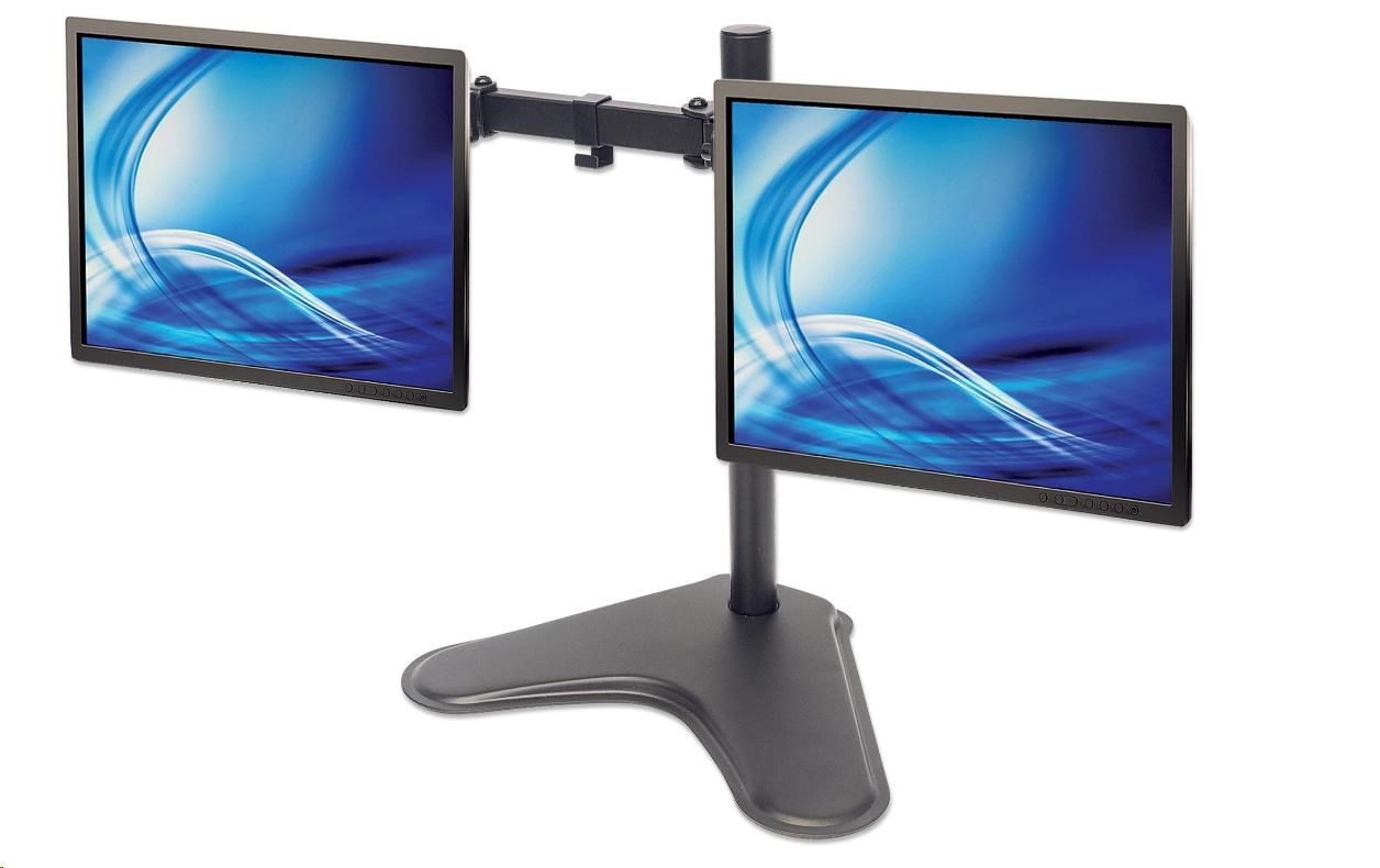 LCD-monitor installation above the desk helps maximize the effectiveness of a potential workspace. The Manhattan Universal Dual Monitor Stand with Double-Link Swing Arms improves organization on the desktop, making it easier to get work done on the computer.