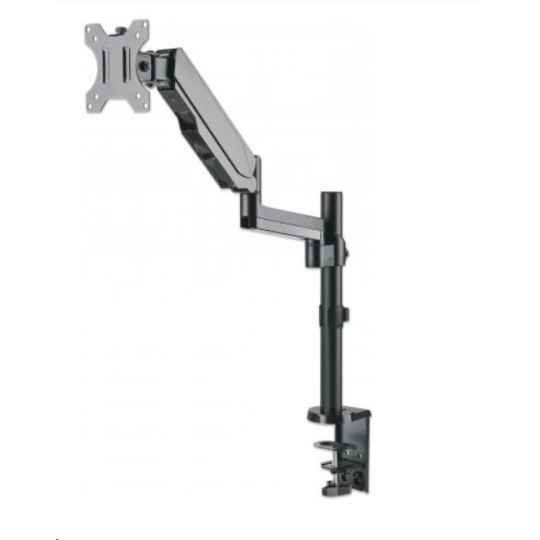 The Manhattan Universal Gas Spring Monitor Mount securely supports one 17" to 32" TV or monitor. Because it uses a gas spring to hold your display, its arm only needs the lightest touch to move your screen to the best viewing angle for you. The mount's high-quality aluminum and steel construction will provide years of reliable service. Ideal for installation on a standard-sized desk, the Manhattan Universal Gas Spring Monitor Mount lets you take advantage of the extra range of movement so you can have more space to get work done.
