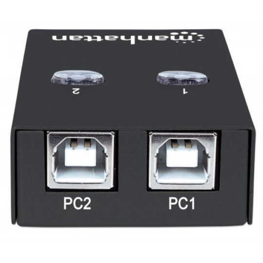 The Manhattan Hi-Speed USB 2.0 Automatic Sharing Switch easily allows two computers to share a USB device. It's ideal for home and office use where users need to share a USB cable modem, printer, digital camera, scanner, external storage drive or other peripheral. Use the convenient access-on-demand switching for activation with a single click of an onscreen button, or use on-board switches to manually select an active computer.