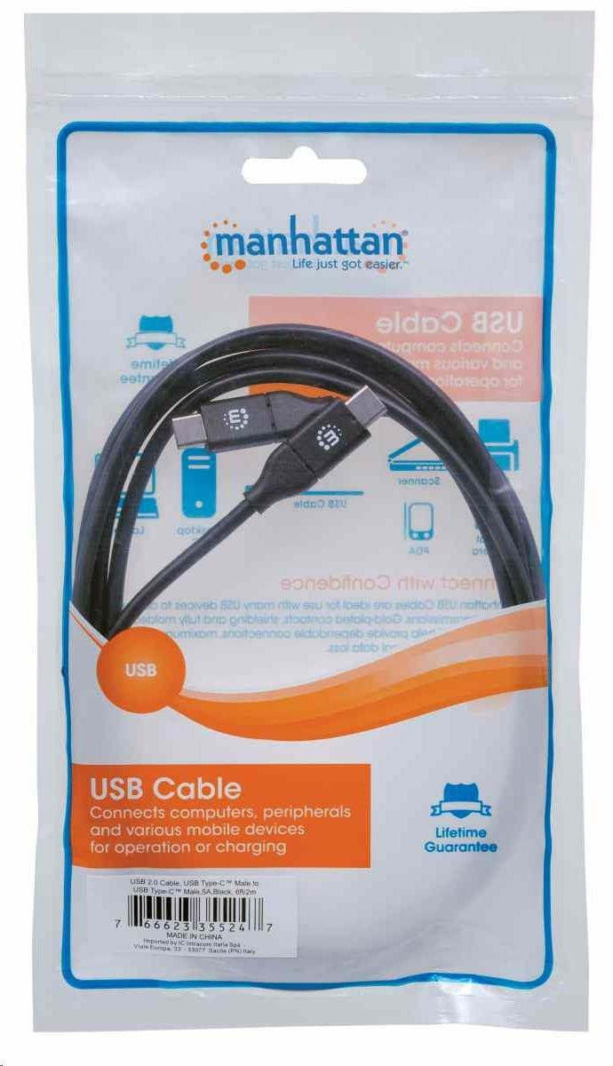 Manhattan USB-C kabel, USB 2.0, Male na Male, 480 Mbps, 5 A, 2m, černá