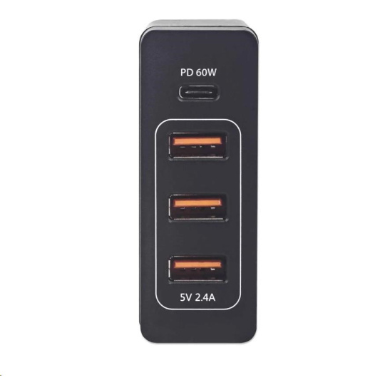 One USB-C Power Delivery Port up to 60 W, Three USB-A Charging Ports Sharing up to 12 W / 2.4 A, Black