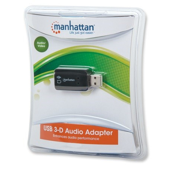 Ideal for desktop, notebook and netbook computers, the Manhattan Hi-Speed USB 3D Sound Adapter instantly creates microphone-in and audio-out ports through any USB port. Easily connect headsets, microphones and speakers equipped with 3.5 mm cables that are too short to comfortably reach ports with awkward or inconvenient locations. With Plug and Play and hot-swap capabilities, it easily replaces inoperative sound cards, bypasses damaged audio ports and improves access without special drivers or software. A built-in Class-B power amplifier utilizes USB bus power, eliminating the need for external energy supplies or additional cables. Support for 3-dimensional audio and virtual 5.1 surround sound and built-in sound effects with a 10-band equalizer deliver rich, high-quality experiences with familiar USB convenience and functionality.