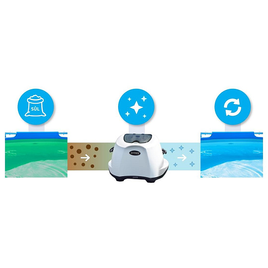 Spuštěním filtrace slaná voda prochází skrz chlorinátor, který přetváří rozpuštěnou sůl na chlór. Vzniklý chlór okamžitě dezinfikuje vodu.