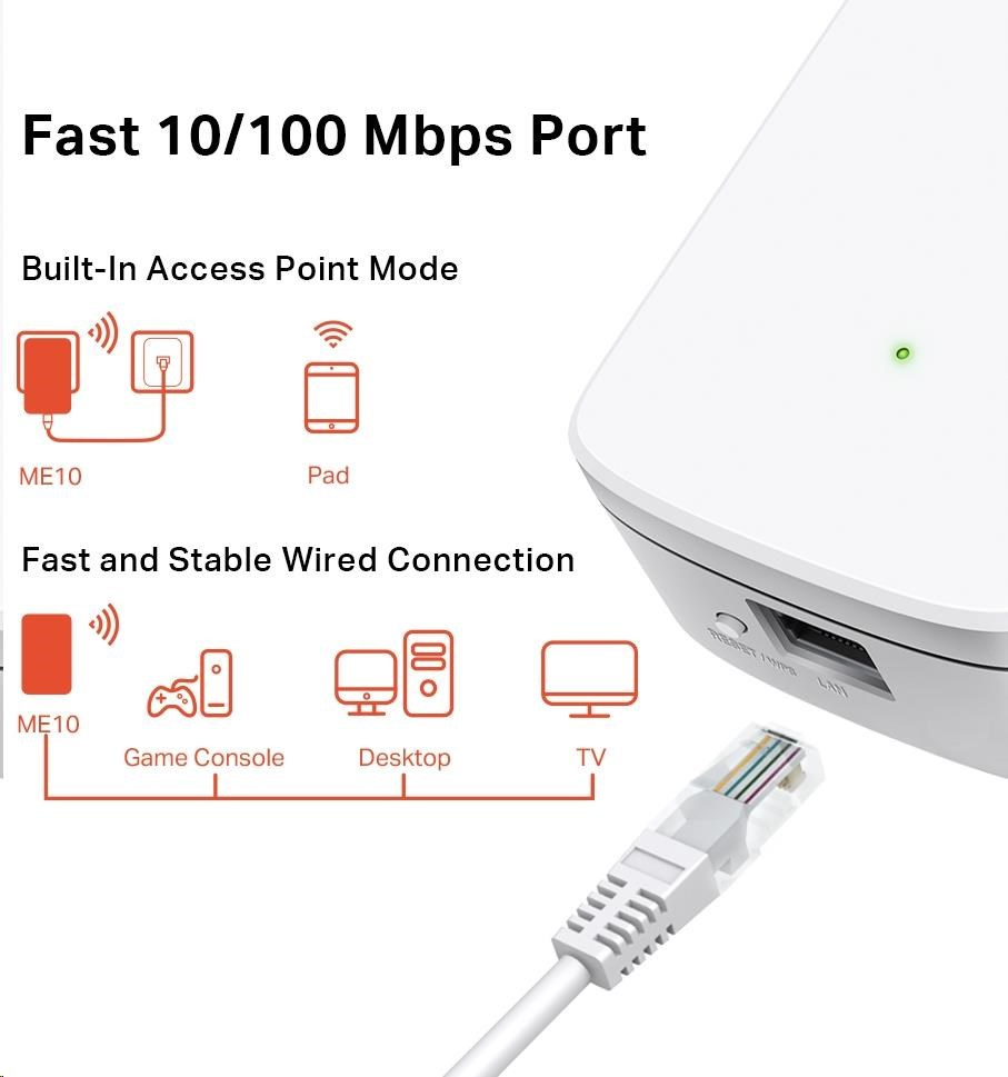 Nástěnný extender signálu ME10 slouží k rozšíření pokrytí Wi-Fi sítě a posílení signálu existující hostitelské sítě. S rychlostmi připojení až 300 Mbit/s můžete Wi-Fi síť každý den používat k hraní on-line her, stahování velkých souborů a sledování filmů na libovolném místě v domě.