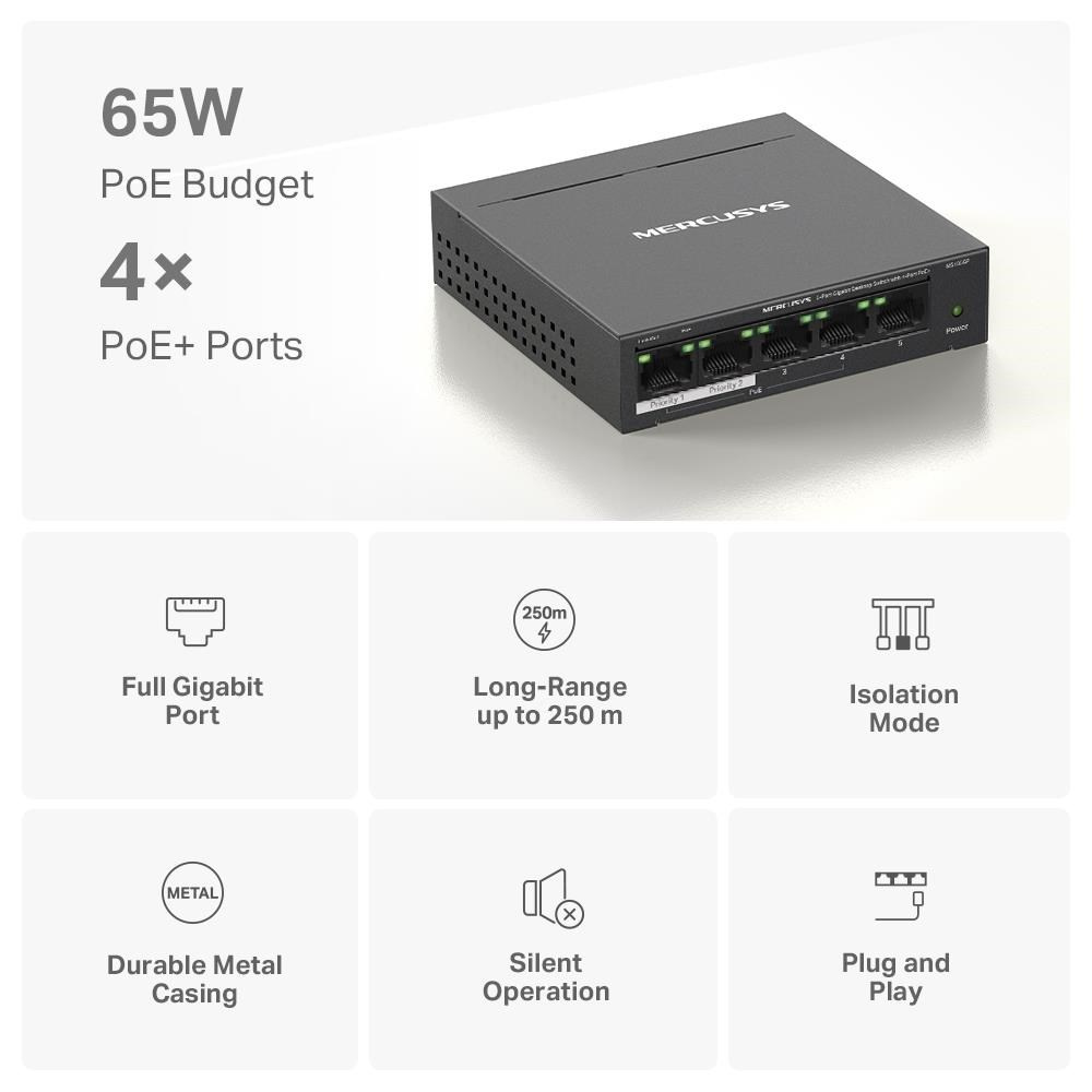 MERCUSYS switch MS105GP (5xGbE,4xPoE+,65W,fanless)