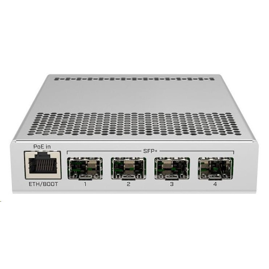 CRS305-1G-4S+IN je kompaktní, přesto velmi výkonný switch, který má čtyři SFP+ porty s rychlostí 10 Gbps/port. Zařízení má také kromě optických portů i jeden Gigabitový ethernet s podporou POE IN pro snadný přístup k zařízení, konfiguraci zařízení nebo jako převod na metalické vedení. K napájení slouží hned dva DC konektory pro redundanci napájení. Switch je velmi elegantní, kompaktní a jeho kovové pouzdro bez ventilátorů zajišťuje tichý provoz.