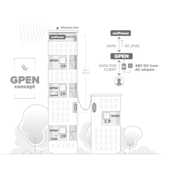 GPEN21 has an Ethernet and SFP port for fiber connectivity. Customers can choose to use GPEN21 to power optical module for uplink to provider, or to provide PoE to power Ethernet uplink to provider (that uses our GPeR and/or netPower products) The GPEN unit can be securely attached to a wall or the communications cabinet. The Ethernet cable can be routed either directly through its bottom cable opening or into the wall, as preferred.