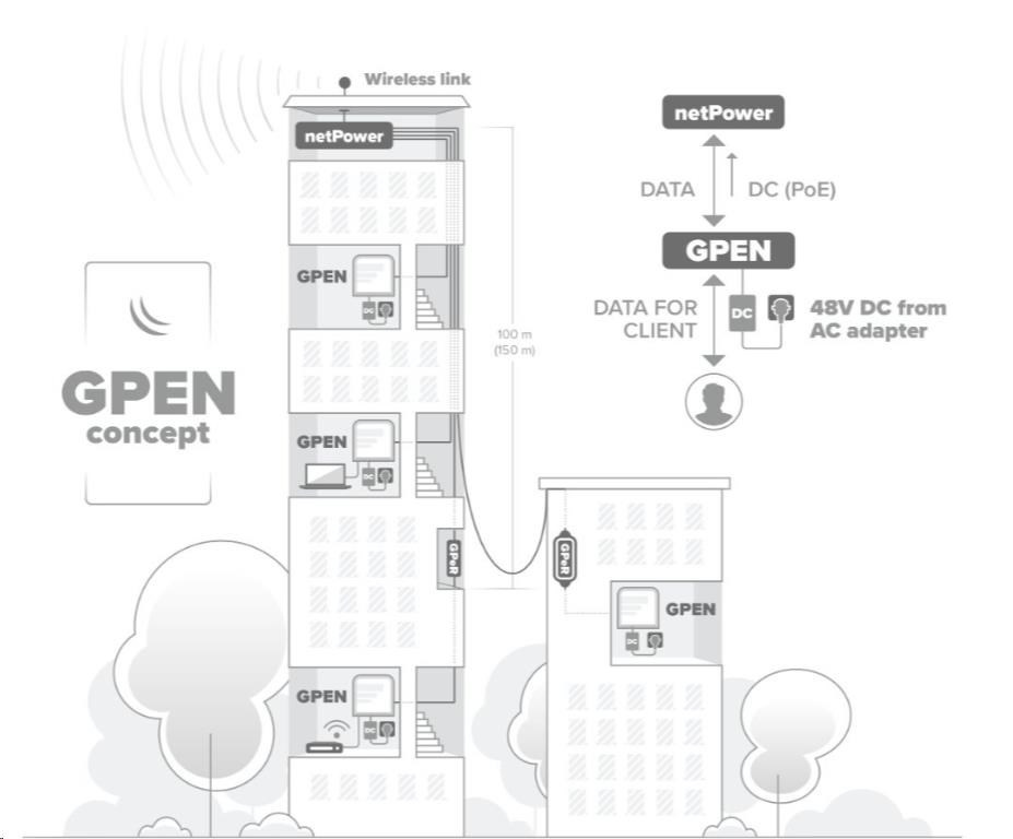The GPEN21 is a smart power injector that serves as an advanced software controlled repeater. Not only can it power your uplink devices via PoE, it can also provide a range of useful software features: Interface management and monitoring