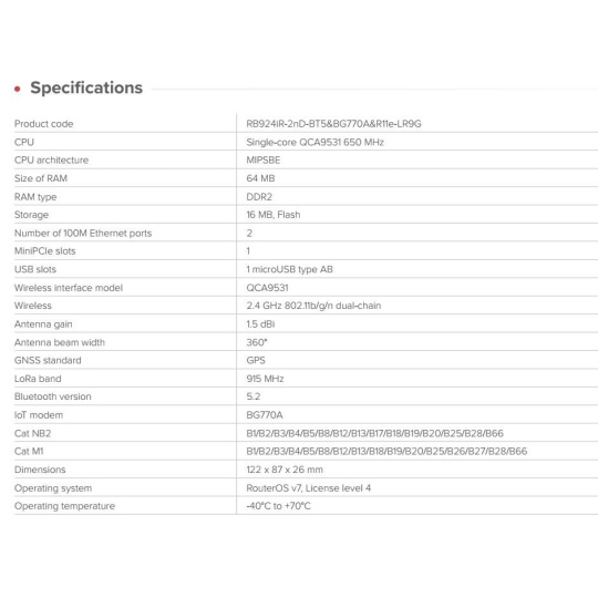 Brána IoT průmyslové třídy pro inteligentní sledování majetku, vzdálené monitorování a efektivní automatizaci - nyní s vylepšeným příjmem LoRa®, souběžným GPS + LTE CAT-M a nižší cenou. KNOT LR9G je kompaktní, ihned použitelná brána pro sítě založené na LoRa®, navržená tak, aby poskytovala cenově dostupnou a spolehlivou konektivitu i v těch nejodlehlejších prostředích. Podporuje LTE CAT-M1 a NB2, Bluetooth 5.2, 2,4 GHz Wi-Fi, GPS a Ethernet s PoE, což z něj činí flexibilní základ pro jakékoli nasazení IoT. Ať už sledujete cenná aktiva v nemocnici, spravujete prodejní automat v nákupním centru nebo monitorujete senzory na zemědělském poli. Funkce a vlastnosti: • Souběžné GPS a LTE CAT-M Sledujte pohybující se aktiva pomocí přesného GPS a zároveň udržujte živé připojení LTE CAT-M1. Ideální pro mobilní jednotky, jako jsou servisní vozidla, kontejnery nebo roamingové terénní zařízení. • Univerzální napájení Vyberte si z PoE-in, DC jack nebo MicroUSB – včetně PoE-out na Ether2 pro napájení dalších zařízení. • SMA konektory pro všechny hlavní rozhraní Snadné nastavení antény pro LTE, GPS a LoRa®. • Vylepšený příjem 915 MHz LoRa® Vylepšená citlivost pro silnější signál a delší dosah, i v prostředí s velkým rušením. • Nižší cena, stejná spolehlivost Cenově výhodné pro rozsáhlá nasazení bez snížení výkonu. • Poháněno RouterOS v7 Pro plnou kontrolu, vlastní skriptování a pokročilé funkce směrování. Příklady praktického nasazení: Sledování majetku nemocnice Připojte majáky Bluetooth ke kritickému zdravotnickému vybavení. Nainstalujte KNOT LR8G do každého skladovacího prostoru. Při pohybu zařízení KNOT detekuje blízké štítky, sleduje polohu pomocí GPS a odesílá aktualizace přes LTE CAT-M - udržuje aktuální stav inventáře a snižuje počet manuálních kontrol. Zemědělství a odlehlé lokality Nasaďte KNOT ke sběru dat z půdních nebo meteorologických senzorů na venkovských polích. Díky podpoře širokého pásma, příjmu LoRa® a kompatibilitě s GPS je ideální pro sběr dat na velké vzdálenosti a s nízkou spotřebou energie. Monitorování chladicího řetězce Používejte kabelové senzory Modbus ke sledování teploty a vlhkosti uvnitř chladicích kontejnerů. KNOT převádí Modbus na TCP a bezpečně předává data prostřednictvím MQTT nebo HTTPS s využitím nízkopásmového LTE nebo NB-IoT. Průmyslová automatizace Přemostění starších kabelových senzorů a akčních členů do cloudu. Díky podpoře lišty DIN a monitorování GPIO se KNOT snadno integruje do průmyslových rozváděčů nebo výrobních prostředí. Upozornění: IoT brána není plnohodnotným LTE routerem. SIM karta není určená pro vytáčení připojení, ale pro komunikaci v síti IoT. IoT brána nedisponuje LTE modemem. Jak by to všechno fungovalo v reálném životě? Představme si nemocnici. Spousta drahého majetku se pohybuje v obrovských budovách. Nástroje, vybavení, léky, na co si vzpomenete. Všechno se neustále přesouvá. neustále přesouvá. Nemocnice obvykle musí vynakládat spoustu prostředků na kontrolu inventáře. Pojďme to napravit. Umístěte na všechny důležité položky lokalizační Bluetooth čipy. Přidejte zařízení KNOT do každého skladovací místnosti. Nyní vedení nemocnice vždy ví, zda se vybavení vrátilo na své místo. Technické specifikace: Product code: RB924iR-2nD-BT5&BG770A&R11e-LR9G CPU: Single-core QCA9531 650 MHz CPU architecture: MIPSBE Size of RAM: 64 MB RAM type: DDR2 Storage: 16 MB, Flash Number of 100M Ethernet ports: 2 MiniPCIe slots: 1 USB slots: 1 microUSB type AB Wireless interface model: QCA9531 Wireless: 2.4 GHz 802.11b/g/n dual-chain Antenna gain: 1.5 dBi Antenna beam width: 360° GNSS standard: GPS LoRa band: 915 MHz Bluetooth version: 5.2 IoT modem: BG770A Cat NB2: B1/B2/B3/B4/B5/B8/B12/B13/B17/B18/B19/B20/B25/B28/B66 Cat M1: B1/B2/B3/B4/B5/B8/B12/B13/B18/B19/B20/B25/B26/B27/B28/B66 Dimensions: 122 x 87 x 26 mm Operating system: RouterOS v7, License level 4 Operating temperature: -40°C to +70°C Napájení: Number of DC inputs: 3 (DC jack, Micro USB, PoE-In) DC jack input Voltage: 12-57 V Micro USB input Voltage: 5-5 V PoE-In input Voltage: 18-57 V Power adapter nominal voltage: 24 V Power adapter nominal current: 1.2 A PoE-In: 802.3af/at PoE-Out: Passive PoE Smart PoE: Injector PoE-Out ports: Ether2 Max out per port output (input < 30 V): 650 mA Max out per port output (input > 30 V): 450mA Max power consumption (without attachments): 6 W Max power consumption: 23 W Internet věcí (anglicky Internet of Things, zkratka IoT) je termínem pro moderní přístroje ovladatelné i na dálku pomocí internetu. Snadno je tak obsloužíte pomocí svého chytrého telefonu nebo je jednoduše připojíte k centrální jednotce. Umožní tak snadno zautomatizovat věci, o které byste se jinak museli postarat sami. Jedná se o technologický koncept umožňující realizaci takzvaného "inteligentního domu" (automatické zhasínání světel, ovládání vytápění apod.). Umožňuje řídit klimatizaci, vyhřívání vašeho bazénu, ohřev vody, pečovat o vaše akvárium, obsluhovat nastavení alarmu či mechanických zámků. Pokud si nejste jistí, zda jste v ranním shonu vypnuli žehličku, můžete na dálku odpojit od sítě jednotlivé zásuvky. Vaše lednička vás dokáže upozornit na chybějící potraviny a připravovat aktualizovaný nákupní seznam. Upozornění Výrobce Mikrotik neposkytuje záruku na zařízení poškozená přepětím. Zařízení je třeba adekvátně chránit proti indukovanému elektrostatickému přepětí či přepěťovým špičkám na silovém vedení. Pro venkovní instalace používat výhradně stíněnou kabeláž (FTP/SFTP), jednotky korektně uzemnit (užití integrovaného zemníc