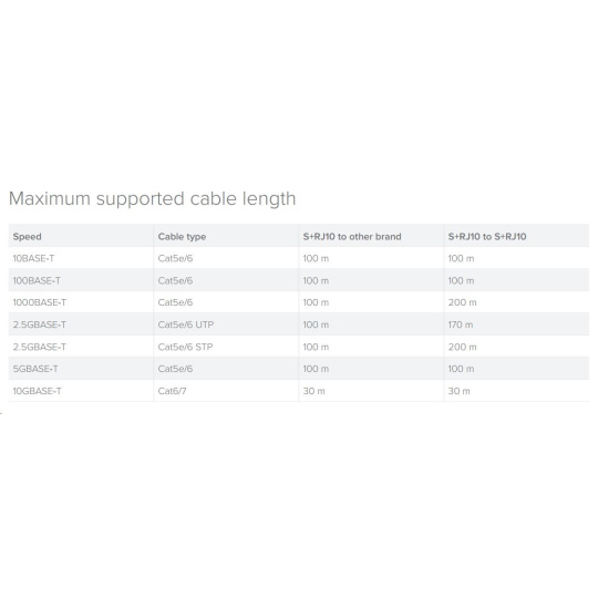 | 2.5GBase-T | Cat5e/6 UTP | 100m | 170m |
