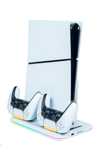 Umístěte svou herní konzoli PlayStation 5 Slim na tento víceúčelový vertikální podstavec od společnosti Nacon. Ten je kompatibilní s diskovou i digitální verzí této konzole a kromě dvou větráčků a jednoho portu USB-A na něm najdete také dvě kolébky sloužící k nabíjení herních ovladačů DualSense, přičemž o stavu jejich nabíjení vás informuje barevné podsvícení pod jednotlivými ovladači.