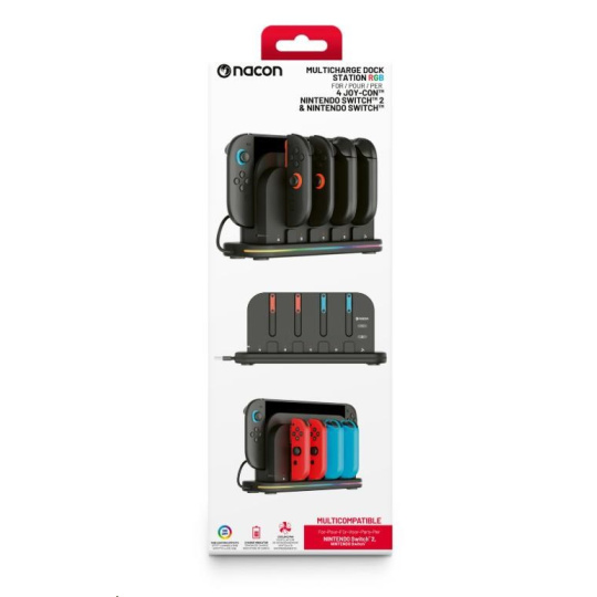 Tato nabíjecí dokovací stanice od společnosti Nacon přijde vhod všem majitelům nové herní konzole Nintendo Switch 2 i původní herní konzole Nintendo Switch, kteří často potřebují nabíjet větší počet ovladačů Joy-Con. Stanice umožňuje nabíjet současně až čtyři ovladače, jakož i samotnou konzoli, jejímuž přehřátí zabraňuje zabudovaný chladicí větráček. O stavu nabíjení každého z ovladačů informuje příslušný LED ukazatel, zatímco RGB proužek s výběrem z devíti různých efektů dodává stanici stylový, moderní vzhled. Protože napájecí USB-C kabel není součástí balení, slouží k připojení stanice do elektrické sítě originální napájecí příslušenství dodávané s konzolí.