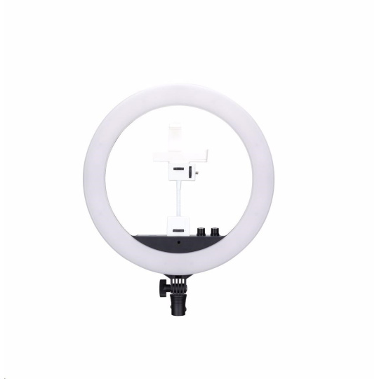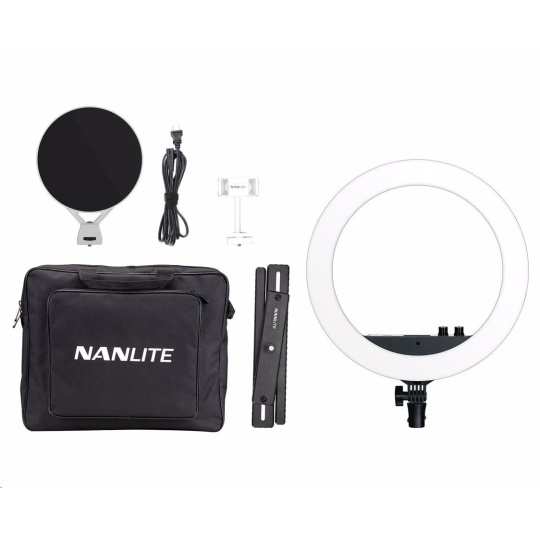 Stmívatelné dvoubarevné LED kruhové světlo Nanlite Halo 14 s napájením pomocí AC adaptéru. Součástí balení je také držák na telefon, make-up zrcátko, přepravní pouzdro a světelný stativ.