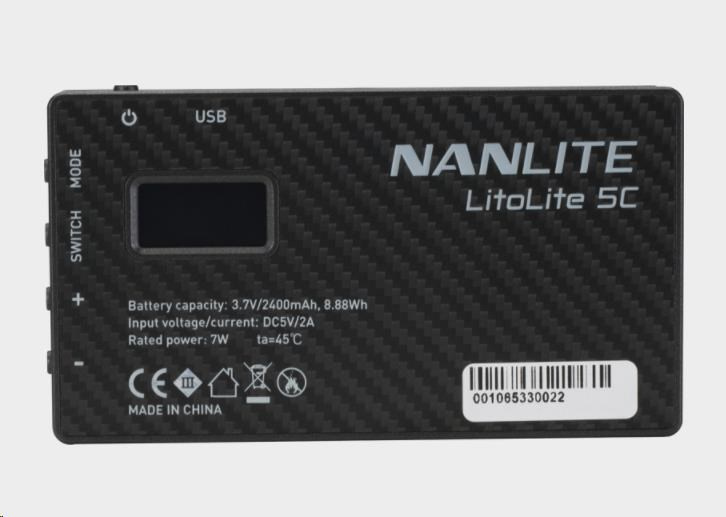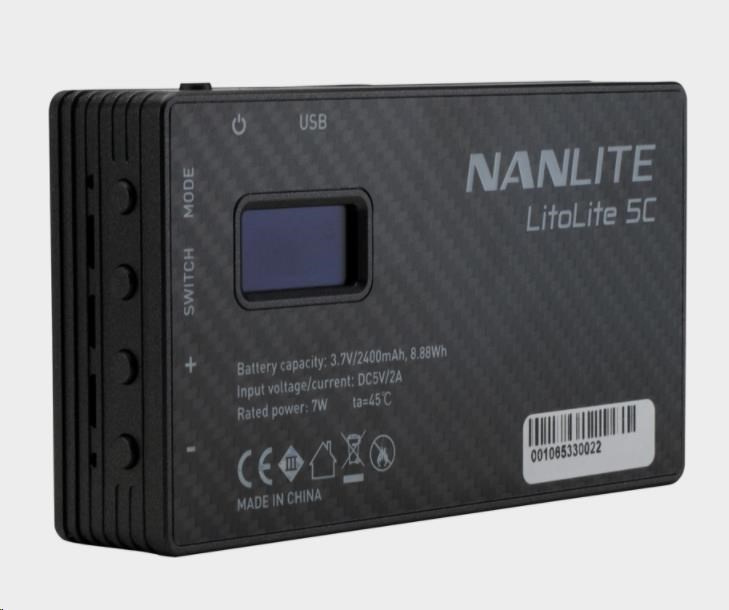LitoLite 5C je kompaktní LED světelný panel s vestavěnou Li-Ion baterií, nabíjením přes USB-C, úžasným jasem, nastavitelnou teplotou barev od 2700K do 7500K s posunem barev od zelené do purpurové, 360° ovládáním odstínu se 100 úrovněmi nastavení sytosti barev a 15ti předprogramovanými, nastavitelnými speciálními světelnými efekty.