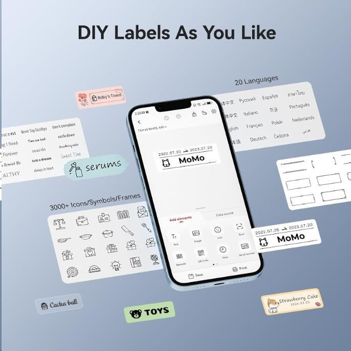 Při navrhování štítku můžete použít různá písma, tvary, ikony, velikosti a formáty, abyste si vytiskli etikety nebo štítky podle své představy. Můžete importovat fotografie z vašeho telefonu nebo obrázky z internetu, aby byl design jedinečnější. Bezplatná aplikace pro iOS nebo Android nabízí více než 1500 ikonek, více než 100 rámečků, 19 fontů písma a umožňuje také tisk QR kódů. Můžete si vybrat z různých stylů písma, velikostí a formátů, abyste si vytiskli etikety nebo štítky přesně podle své představy. Tiskárna automaticky rozezná vložené etikety a aplikace přizpůsobí rozměry pro tisk.