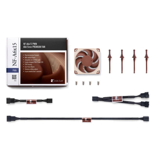 NF-A6x15 je vysoce optimalizovaný tichý ventilátor prémiové kvality o rozměrech 60x15 mm, který je vybaven pokročilými aerodynamickými konstrukčními opatřeními, jako jsou Flow Acceleration Channels a rám Noctua AAO. Verze s PWM využívá speciálně navržený integrovaný obvod NE-FD1 společnosti Noctua pro plně automatickou regulaci otáček prostřednictvím 4pinových záhlaví ventilátoru a dodává se s adaptérem Low-Noise Adaptor pro snížení maximálních otáček při PWM regulaci z 3500 na 3050 ot/min. Jeho vynikající plynulost chodu, ložisko SSO2 a důvěryhodná prémiová kvalita společnosti Noctua z něj činí elitní volbu pro nejvyšší nároky.