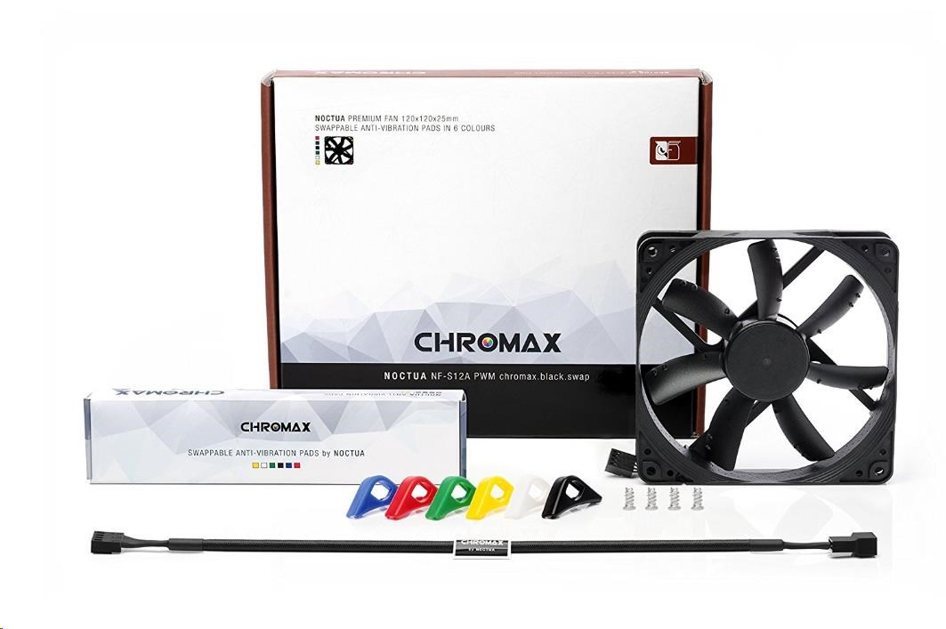 ventilátor, ultratichý, rozměry 120x120x25mm, hlučnost 17.8dB, průtok 107.5 m3/h, 300 až 1200 otáček, optimalizovaná geometrie a povrch lopatek, SSO2, edice Chromax - vyměnitelné barevné antivibrační podložky