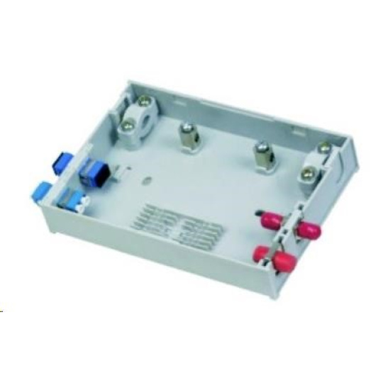 Malý plastový rozvaděč pro odbočkování z hlavního vedení. Umístění 6-ti svarků, 1x průchozí kabel hlavního vedení, 4 výstupní porty. Výstupní porty lze osadit simplex adaptéry pro ST, SC, FC a duplexním LC. Součástí je adaptér pro pigtail kabely (6 otvorů, 3mm průměr).