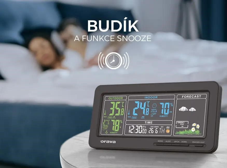 Nastavte si svoji meteostanici i jako budík! A pokud si chcete dopřát ještě pár minut vytouženého spánku využijte funkci zdřímnutí (SNOOZE), která vám budík odloží o 5 minut.