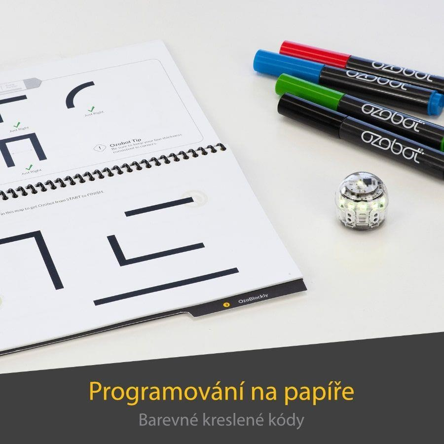 Jak už bylo zmíněno, děti i dospělí mohou kódovat Ozobot Evo dvěma způsoby. Pro začátek vám k programování stačí fixy a papír. Vaším úkolem bude nakreslit pro robota vodící černé linie, které by mohl sledovat. Na ně umístíte barevné kódy složené ze sekvence červených, zelených a modrých čtverečků. Ty robotovi určí směr, rychlost, spustí počítadlo nebo časovač, popřípadě mu dovolí předvést cool pohyby. Ozokódů, kterými dráhu můžete okořenit, existuje spoustu. A nebojte – nemusíte se je učit zpaměti. Jejich přehled můžete mít vy i děti neustále po ruce. Věnujete se malým dětem, pro které by i kreslení drah s barevnými kódy mohlo být obtížné? Chcete ušetřit množství spotřebovaného papíru? Základní startovací kit můžete rozšířit o sadu magnetů, které je perfektně zastoupí.Další možností je vizuální programování v aplikaci či online blokových editorech Ozobot Blockly a Ozobot Editor. V tomto velmi intuitivním prostředí mohou hlavně starší žáci řadit za sebou jednotlivé bloky s pohyby, zvuky, světelnými efekty, smyčkami a časovači a vytvářet přitom jejich unikátní kombinace. Složitost jednotlivých úkonů je přehledně rozdělena do celkem 5 úrovní, aby si každý malý programátor mohl vybrat tu svou. Vaše originální programy pak nahrajete přímo do bota a necháte ho převést je v akci. Nově lze celé prostředí editoru přepnout do jazyka Python a naučit studenty používat i tento programovací jazyk. Ať už zvolíte jakoukoliv metodu, procvičíte si své dovednosti tvořit posloupnosti, příkazy, pracovat s logikou a posilovat schopnost řešit problémy.