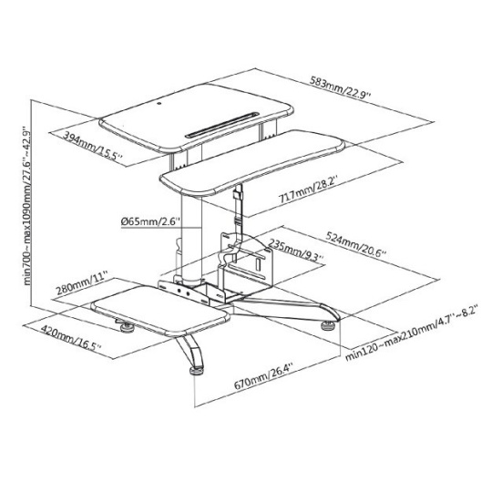 PC pracovní stanice Fiber Mounts M8C48 Pracovní stanice na PC, monitor, tiskárnu, klávesnici a myš, nastavitelná výška pro změnu pozice pro práci vsedě nebo vestoje 70-109cm, nosnost 30kg Moderní pracovní stanice s nastavitelnou výškou pro práci v sedě nebo vestoje. Díky unikátnímu systému plynové pružiny velmi snadno a rychle upravíte výšku a můžete pracovat buď vsedě nebo vestoje. Pracovní stanice obsahuje dolní držák na PC, polici na tiskárnu nebo jakékoliv příslušenství, horní pracovní desku na monitor s možností použití držáků na monitory, a polici na klávesnici a myš. Pracovní stanice je vynikající kvality, spolehlivá konstrukce zaručuje bezpečnost, stabilitu a dlouhou životnost (10 i více let). Barevné provedení černé, záruka 3 roky. Pracovní stanice na PC, tiskárnu, klávesnici, myš a pracovní deskou na monitor. Výškové polohování pro práci v sedě nebo ve stoje. Kancelářská pracovní stanice Fiber Mounts M8C48 Technické údaje: nosnost 30kg výškové polohování pro práci v sedě nebo vestoje 70-109cm snadné a rychlé nastavení výšky díky plynové pružině deska na monitor, možnost použití stolních držáků na monitory polička na klávesnici a myš, šířka 717mm spodní police na příslušenství - tiskárnu apod. univerzální držák pro uchycení PC toweru stabilní podstava, stojky vynikající, velmi pevná konstrukce barevné provedení černé záruka 3 roky Dolní polička na příslušenství, např. tiskárnu a univerzální držák na PC tower na pracovní stanici Fiber Mounts M8C48 Pracovní stanice Fiber Mounts M8C48 mají velmi široké spektrum využití, od kanceláří a firem, konferenčních místností až po domácnosti, kde není místa nazbyt. Unikátní konstrukce s plynovou pružinou umožňuje kdykoliv velmi rychle změnit pracovní výšku pro práci v sedě nebo vestoje. Horní deska na monitor je vhodná i pro použití stolních držáků na monitory - monitor můžete mít volně položený na podstavci nebo uchycený na držáku..