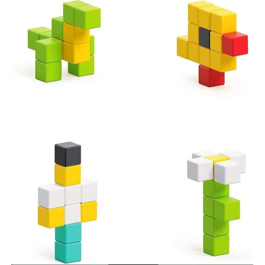 Každý z magnetických bloků PIXIO je kostka o velikosti 8x8x8mm. Uvnitř je 6 malých magnetů vážících méně než 1 g. Chytrý a unikátní design magnetů dávají nekonečné možnosti skládaní obrazců – neexistuje špatný postup, jak stavět a tvořit, protože jde jenom o kreativitu, představivost a šikovnost tvůrce. Všechny modely PIXIO jsou mezi sebou kompatibilní.