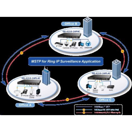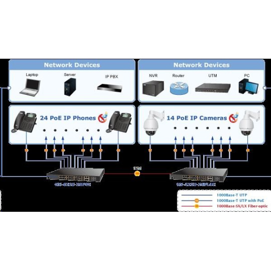 Gigabitový spravovatelný přepínač s PoE (power over ethernet) porty pro centralizované napájení zařízení po ethernetu jako jsou IP kamery, WiFi prvky nebo VOIP telefony. Zařízení je svým provedením vhodné jak pro instalaci do kancelářských nebo prezentačních prostorů. Je vhodné i pro aplikace v lokálních rozvaděčích, připojení lze realizovat optickýmy porty SFP. Bezpečnou správu zajistí šifrovaná webová správa nebo SNMPv3 protokol. Připojení koncových uživatelů lze zabezpečit ACL/MAC pravidly nebo možnou autorizací na server RADIUS/TACACS.  Vlastnosti: - 28 portů 1000Base-T, Switching, Full Duplex (1000/2000 Mbps), Auto-Negotiation (10/100/1000 Mbps) - 24x vestavěné PoE injektory 802.3at, každý injektor až 30W/port; celkový max. napájený výkon až 440W - 4x SFP sdílené s metalickými (25-28), 100/1000Base-X, pro instalaci optických modulů mini-GBIC s označením MFB a MGB - Auto-MDI/MDI-X, automatická detekce přímý skřížený kabel i pro 10/100Mbps - ESD ochrana na všech portech do 2kV DC - 8k MAC adres, 4,1MB buffer - propustnost: 52Gbps sběrnice, datově 42Mp/s (64B) - podpora přenosu Jumbo rámců o velikosti 10KB - správa: WEB / SNMPv3 / telnet / konzole; podpora SSL/SSH - podpora protokolů IPv4/IPv6 - VLAN IEEE 802.1Q, až 256 skupin, až 4094 VLAN ID; protokolové, VoIP a privátní VLAN - agregace portů LACP 802.3ad, až 8 skupin po 8 portech - QoS 8 front, klasifikace podle provozu, váženého průměru nebo značky VLAN - Spanning tree protokol: STP IEEE 802.1D / RSTP IEEE 802.1w / MSTP IEEE 802.1s - IGMPv3 Snooping, Querier, až 256 multicast skupin - zrcadlení portů-port mirroring TX/RX/TX+RX/více na jeden port - zabezpečení klientů: ACL (access control list), MAC statická tabulka pro autorizovaná zařízení, autorizace na RADIUS/TACACS+, DHCP snooping, spojení IP+MAC na porty - ochrana proti DoS útokům - pole LED indikátorů pro diagnostiku provozu - tepelná ochrana proti přehřátí - rozměry: (440 x 300 x 44,5)mm, montáž 19"/1U - hmotnost 4,8kg - provozní teplota: 0-50°C - interní napájecí zdroj AC 110-240V/50-60Hz, vlastní příkon asi 30W.