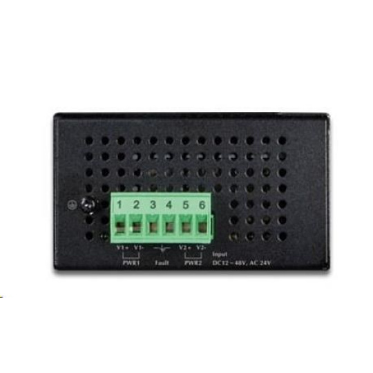 Duální napájení v rozsahu DC 12-48V / AC 24V, krytí IP30, hliníková skříň, pracovní teplota -40~75°C. Přepěťová ochrana ESD do 6kV. Montáž na DIN lištu nebo přímo na zeď.