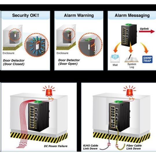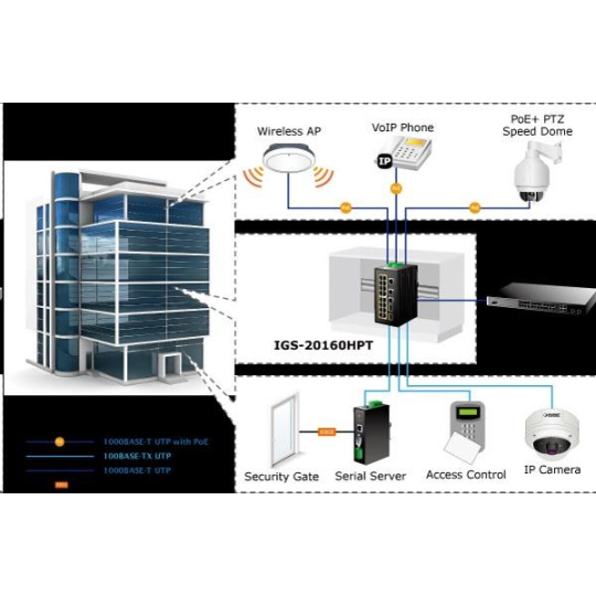 Planet IGS-20160HPT, 18x 1000BASE-T, 16x PoE 320W, 2x SFP, DIN, IP30, -40 AŽ 75°C, WEB/SNMPV3 IInteligentní přepínače pro průmyslový Ethernet jsou určeny do náročných provozních podmínek s velkým rozsahem pracovních teplot, nejistým napájením a častými otřesy. Zároveň poskytují vynikající možnosti vícenásobných propojení pro dosažení robustnosti propojení systémů s velmi nízkou dobou zotavení. IGS-20160HPT je vybaven pro redundanci kromě dobře známé metody Spanning Tree (jejíž doba zotavení je v řádu sekund) především specializovanou funkcí ERPS (Ethernet Ring Protection Switching), která má dobu zotavení a nalezení nové cesty do 50ms. Je podporováno statické L3 routování pro až 32 pravidel a 128 VLAN rozhraní. Přepínače řady IGS se snadno instalují na standardní DIN lištu nebo přímo na zeď a umožňují nasazení dobře známé Ethernetové technologie i v průmyslovém prostředí. Stejně tak jsou vhodné pro instalace do venkovně umístěných skříní s velkým kolísáním pracovních teplot (typicky bezdrátové a MAN ISP aplikace). Jejich velkou předností je prodloužená střední doba mezi výskytem poruch (MTBF)! Síťové vlastnosti: - 18 portů 1000Base-T, Switching, Full Duplex (1000/2000 Mbps), Auto-Negotiation (10/100/1000 Mbps), automatická detekce přímý/křížený kabel na každém portu - z toho 16 portů PoE injektory IEEE 802.3at se zatížitelností 30W/port; celkově až 320W při duálním napájení, při jednoduchém napájení výkon do 260W - 2 porty SFP pro instalaci modulů 1000Base-SX/LX/BX nebo 100Base-FX, sdílené s metalickými porty 17-20, podpora SFP-DDM (Digital Diagnostic Monitor) - 1x sériová konzole, RJ-45 - propustnost: sběrnice 40Gbps, provozně 29,7Mp/s(64B) - podpora přenosu Jumbo Frame do 9kB, 8k MAC adres, buffer 4MBits - správa přepínače Web/SNMPv3/konzole s podporou zabezpečeného přenosu SSH/SSL - alarm email ve spojení s I/O a stavem linek - podpora TCP IPv4/IPv6 - L3 statické routování, až 32 pravidel a 8 VLAN rozhraní - 255 VLAN IEEE 802.1Q sítí, MAC nebo protocol based VLAN, VoIP VLAN - agregace linek "port trunking" IEEE 802.3ad LACP, až 10 skupin po 8-mi portech - IGMP v1,v2,v3 až do 256 multicast skupin, IGMP querier mode - 8-úrovní QoS prioritizace provozu dle portu, DSCP/ToS, 802.1p nebo 802.1Q značky - port shaper v rozsahu 500kb-1000Mb/s - IEEE 802.1d Spanning tree protocol, IEEE 802.1w Rapid spanning tree protocol, IEEE 802.1s Multiple spanning tree protocol - "E.R.P.S ring" pro kruhovou topologii s dobou zotavení <50ms- IP/MAC ACL (access control list) do 256 pravidel - IEEE 802.1x (RADIUS) - IP+MAC binding, VLAN + MAC binding, 256 pravidel - zrcadlení portů: TX / RX / RX+TX, více portů na jeden - DHCP snooping pro potlačení nežádoucích serverů v síti - IEEE 802.1ab LLDP: automatická detekce typu připojených zařízení - diagnostika kabeláže, stanovuje délku kabeláže a případnou vzdálenost k závadě - podpora MODBUS protokolu (platí pro poslední verzi firmware) Fyzické vlastnosti: - napájení: duálně DC 48~56V, připojení není nutné ale je doporučené ze dvou různých zdrojů (nejsou součástí balení) - vlastní příkon <11W- I/O digitální rozhraní: 2x vstupy + 2x výstupy, terminálový blok - spínací poplachové relé (24V/1A) při výpadku primárního napájení - instalace na DIN lištu nebo na zeď, montážní díl součástí - krytí IP30 - pole LED indikátorů pro diagnostiku provozu - ochrana proti přepólování, připojení napájení na svorkovnici, umístění na spodním panelu (nepřekáží při montáži na zeď) - přepěťová ochrana LAN portů proti elektrostatickému náboji do 6kV (ESD) - zařízení je odolné proti pádu (IEC-60068-2-32) z výšky 75cm na všechny dopadové části - zařízení je odolné proti vibracím (IEC-60068-2-6) 10-500-10Hz, 4x g, 0,5oct/min - zařízení je odolné proti přetížení krátkodobému zrychlení 50g, dlouhodobému 4g, (IEC-60068-2-27) - EMI/EMS, elektromagnetická kompatibilita a slučitelnost dle CE EN-6100-4-2,3,4,5,6 - elektrická bezpečnost dle CE EN-60950 - provozní teplota -40 až 75°C, vlhkost do 95% - hmotnost: 1533g - rozměry(mm): 152 x 107 x 84.