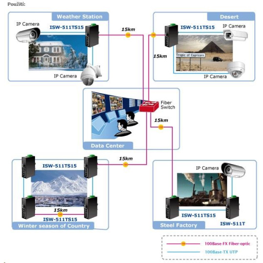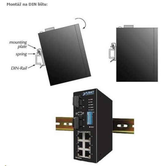 Planet ISW-511T, 4x 10/100Base-TX+ 1x 100FX 2km, MM, DIN, IP30, -40~75°C  Přepínače pro průmyslový Ethernet jsou určeny do náročných provozních podmínek s velkým rozsahem pracovních teplot, nejistým napájením a častými otřesy. Přepínače řady ISW se snadno instalují na standardní DIN lištu nebo přímo na zeď a umožňují nasazení dobře známé Ethernetové technologie i v průmyslovém prostředí. Stejně tak jsou vhodné pro instalace do venkovně umístěných skříní s velkým kolísáním pracovních teplot (typicky bezdrátové a MAN ISP aplikace).  Vlastnosti: - 4 porty 100Base-TX, Switching, Full Duplex (100/200 Mbps), Auto-Negotiation (10/100 Mbps), automatická detekce přímý/křížený kabel na každém portu - 1 port 100Base-FX, full duplex, SC konektory, multimodemode, pro 50/125um a 62,5/125um vlákno, dosah 2km, vlnová délka 1300nm, zdvih min. 15,5dB (vysílací výkon max. -14dBm, min. -19dBm, přijímací citlivost -34,5dBm) - 1M buffer, propustnost sběrnice 1Gbps, 0,74Mpps (64B), tabulka 2k MAC adres - pole LED indikátorů pro diagnostiku provozu - instalace na DIN lištu, montážní díl součástí - instalace na zeď, montážní díl součástí - krytí IP30, skříň celohliníková - napájení: 12-48V DC redundantní, připojení možné ze dvou různých zdrojů (nejsou součástí balení) - ochrana proti přepólování, připojení napájení na svorkovnici, umístění na spodním panelu (nepřekáží při montáži na zeď) - QoS prioritizace provozu dle portu, ToS, 802.1p - zařízení je odolné proti pádu (IEC-60068-2-32) z výšky 75cm na všechny dopadové části - zařízení je odolné proti vibracím (IEC-60068-2-6) 10-500-10Hz, 4x g, 0,5oct/min - zařízení je odolné proti přetížení krátkodobému zrychlení 50g, dlouhodobému 4g, (IEC-60068-2-27) - EMI/EMS, elektromagnetická kompatibilita a slučitelnost dle CE EN-6100-4-2,3,4,5,6 - elektrická bezpečnost dle CE EN-60950 - pracovní teplota -40 až 75°C, vlhkost do 95% - příkon do 14W - rozměry: 135 x 97 x 32 mm - hmotnost: 436g.