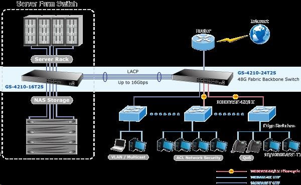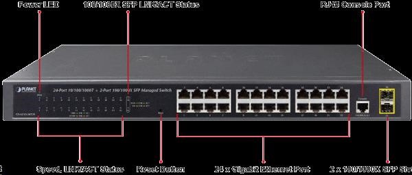 Gigabitový spravovatelný přepínač pro instalaci do náročnějších lokálních sítí, disponuje širokou škálou funkcí pro zajištění provozu bezpečné sítě eliminací možných útoků na nižších vrstvách modelu OSI a možnou autentizací koncových zařízení. Připojení koncových uživatelů lze zabezpečit ACL/MAC pravidly nebo možnou autorizací na server RADIUS/TACACS. Bezpečnou správu zajistí šifrovaná webová správa nebo SNMPv3 protokol prostřednitcvím IPv4 nebo nově IPv6 protokolem. náhrada za GSW-2404SF - 24 portů 1000Base-T, Switching, Full Duplex (1000/2000 Mbps), Auto-Negotiation (10/100/1000 Mbps) - 2x SFP, 100/1000Base-X, pro instalaci optických modulů mini-GBIC s označením MFB a MGB - Auto-MDI/MDI-X, automatická detekce přímý skřížený kabel i pro 10/100Mbps - 8k MAC adres, 4,1MB buffer - propustnost: 52Gbps sběrnice, datově 38,6Mp/s (64B) - podpora přenosu Jumbo rámců o velikosti 9KB - správa: WEB / SNMPv3 / telnet / konzole(COM port); plná podpora protokolů IPv4/IPv6 - VLAN IEEE 802.1Q, až 256 skupin, až 4094 VLAN ID, protokolové VLAN, VoIP-VLAN - agregace portů LACP dle IEEE 802.3ad, až 8 skupin po 8-mi portech - QoS 8 úrovní pro 8 front; klasifikace podle provozu, váženého průměru nebo příznaků IEEE 802.1p a DSCP - Port shaper: datová limitace rychlosti - Spanning tree protokol IEEE 802.1D: STP / RSTP / MSTP - IGMPv3 Snooping, Querier, až 256 multicast skupin - podpora LLDP protokolu - zrcadlení portů-port mirroring: TX / RX / TX+RX - zabezpečení klientů: ACL (access control list), MAC statická tabulka pro autentizovaná zařízení, podpora ověření vůči serverům RADIUS/TACACS+, DHCP snooping - ochrana DoS proti útokům v síti, StormControl proti eliminaci chybných provozů - pole LED indikátorů pro diagnostiku provozu - ESD ochrany proti statické elektřině - rozměry: (445 x 207 x 45)mm, hmotnost 2,1kg - provedení rackmount 19"/1U - provozní teplota: 0-50°C - interní napájecí zdroj AC 110-240V/50-60Hz, vlastní příkon do 14W - fanless: žádný ventilátor.