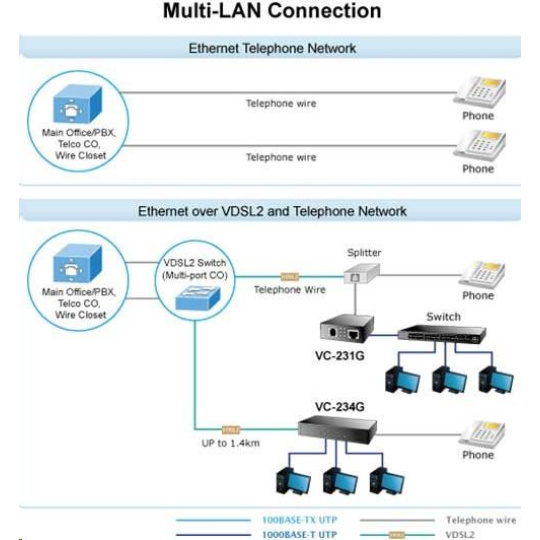 PLANET VC-231G Ethernet po telefonním vedení (technologie VDSL2). 1x LAN RJ-45, 1x VDSL2 RJ-11. Transparentní bridge. G.993.2 VDSL2, G.993.5 G.Vectoring + G.INP. Kapacitně 200/160Mbps na 200m. Dosah až 1,4km. Nastavení DIP přepínači, volitelně Master (CO) / Slave (CPE). Možný provoz na VDSL O2 lince.  LRE (Long Reach Ethernet) konvertor ethernetu na VDSL2 (Very-high-data-rate Digital Subscriber Line 2) konvertor ethernetu dovoluje přenést data symetrickým párem vodičů rychlostí až 200Mbitů/s na 200m nebo 30Mbitů/s do vzdálenosti až 1,4km, přenosové rychlosti dle stavu a kvality použitého vedení. Zařízení je univerzální jako master (CO) / slave (CPE) jednotka, nastavení režimu přepínačem. Jednotka podporuje VDSL2 operační módy dle přenosových profilů "17a" a "30a", volbu dle "band Plan997" a G.993.5 G.Vectoring & G.INP postihující symetrický přenos dat vyšší rychlostí i na souběžném vedení. S pomocí externího spliteru lze zachovat hlasovou službu na telefonním vedení bez další úpravy zapojení. S výhodou tak lze využít telefonní kabelová vedení původně určená pro spojení nejen k účastníkům ale i mezi analogovými ústřednami. ISP (internet service provider) poskytovatelům je tak umožněno nabízet multimediální služby, VOD (video on demand), VoIP (voice over IP), Video phone, IPTV, apod.  Aplikace VDSL2 s pokročilým G.INP a G.Vectoringem lze provozovat i v rámci aktivních prvků rozhraním SFP diky modulu XL-MGB-VDSL2-R2 (viz. doporučené příslušenství). Modem lze úspěšně provozovat nad VDSL linkami O2. ZÁKLADNÍ SPECIFIKACE  Porty:  1 x 10/1000Base-T, RJ-45 1 x VDSL, RJ-11 Podpora přenosu: JumboFrame 2K MAC adres Soulad s normami: IEEE 802.3, IEEE 802.3u, IEEE 802.3ab, IEEE 802.3x, IEEE 802.3p Transparentní pro: IEEE 802.1Q VLAN tag Standard: ITU-T: G.993.1 - VDSL, G.997.1, G.993.2 - VDSL2 (profily 17a/30a), G.993.5 G. - Vectoring a G.INP, G.998 DIP přepínání: volba CPE/CO, volba modulace, volba komunikačního limitu, volba SNR Napájení: z externího adaptéru, 5V/2A  Provozní teplota: 0 až 50°C, vlhkost <90% Rozměry: 97 x 70 x 26 mm Hmotnost: 184 g  Lze instalovat do šasí: MC-700, MC-1500, MC-1500R  Příklad dosahů a rychlostí (down/up Mb/s) na vedení s vodiči AWG24 a lepších: 200m -> 225.34Mb/122.39Mb 400m -> 151.89Mb/78.78Mb 600m -> 90.42Mb/49.93Mb 800m -> 57.70Mb/29.87Mb 1000m -> 45.33Mb/9.21Mb 1400m -> 34.74Mb/5.75Mb  Nastavení pro O2 VDSL připojení modem v režimu CPE; další DIP přepínače Transmision, Band, SNR podle kvality linky v routeru na WAN rozhraní aplikovat VLAN ID:848 nad WAN nastavit PPPoE klienta, Login: O2/O2 dále věnujte pozornost nastavení vašeho routeru, jeho firewallu, přístupových práv, UPnP, atd..